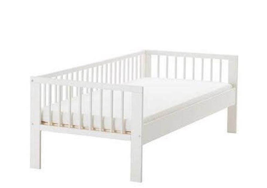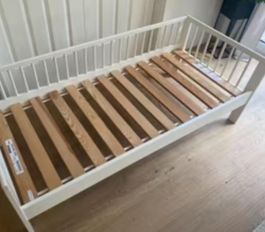 Дитяче ліжко IKEA Gulliver (160x70), включаючи матрац та постільну білизну. Це дитяче ліжко IKEA ідеально підходить після дитячого ліжечка. Розмір ліжка 160x70 і воно міцне (я іноді сплю поруч із ним). Ліжко має підняті краї з трьох боків із закругленими перекладинами та закругленими кутами. Його можна розмістити відкритою стороною до стіни або відкритою стороною до кімнати. Ліжко постачається з матрацом (завжди захищеним протипротіканнями Molton), дитячою ковдрою на 4 сезони, кількома підковдрами (багато рожевого кольору, деякі унісекс) та простирадлами. Ліжко вже розібране та легко збирається.