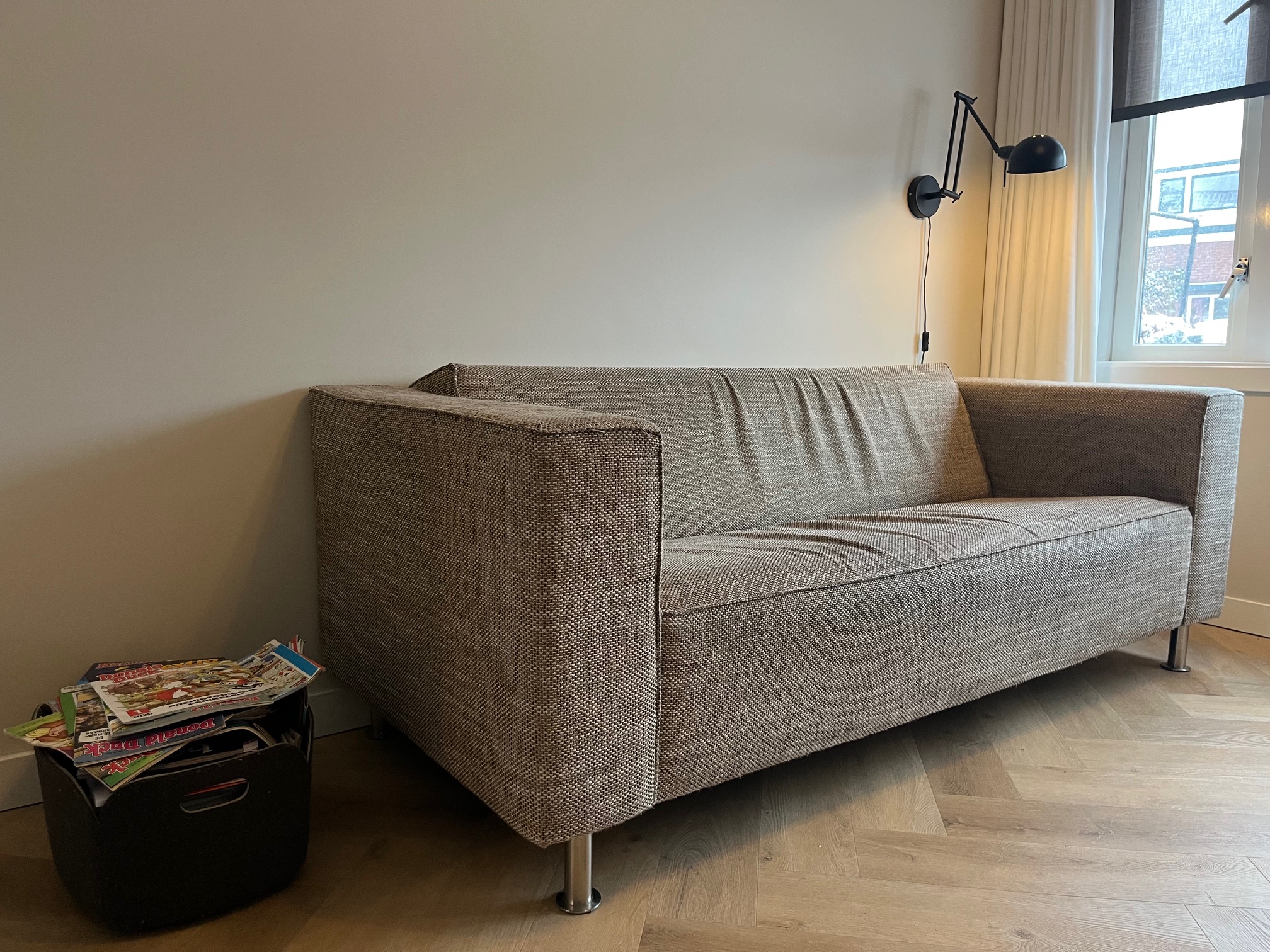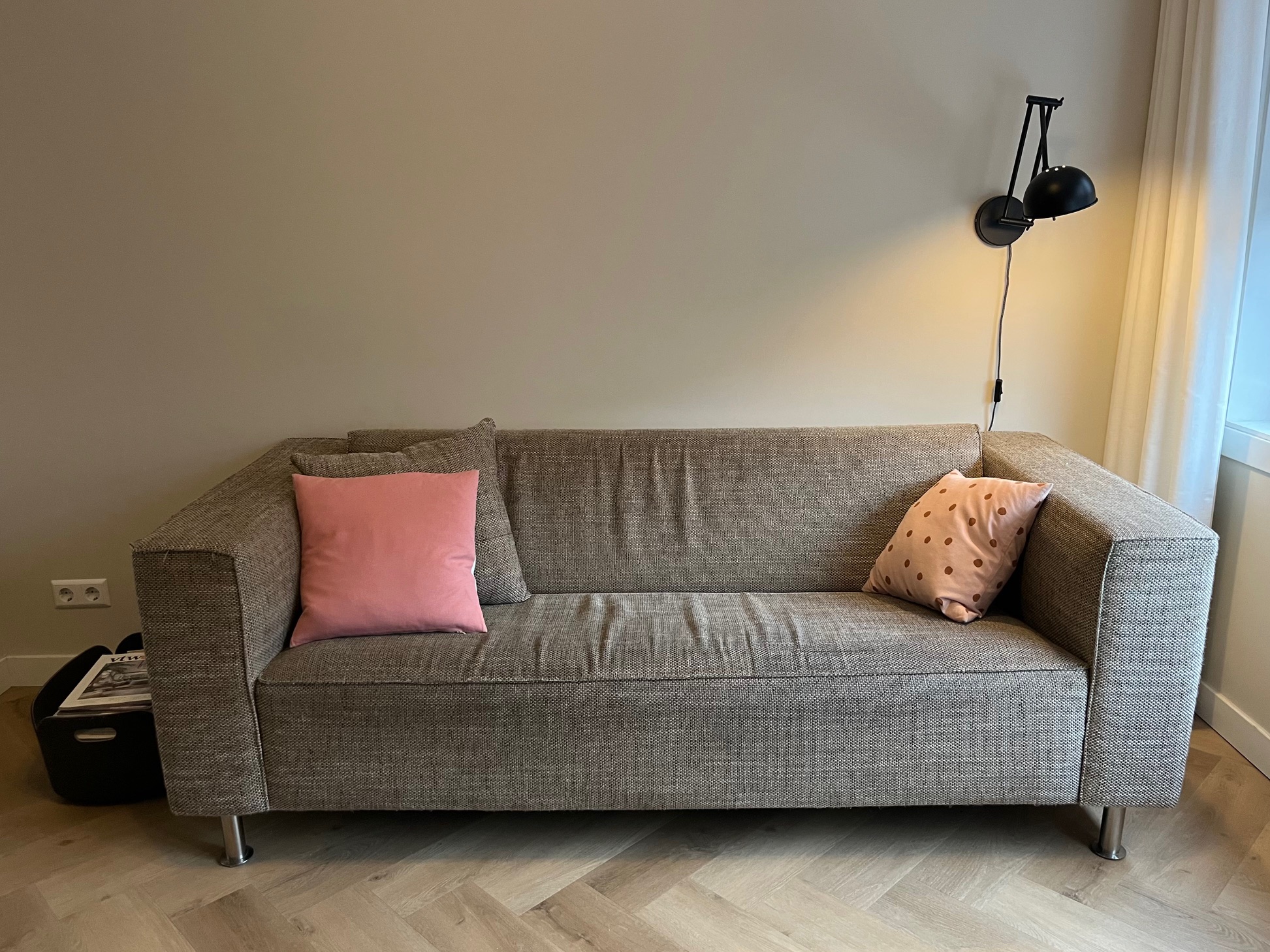 Зручний двомісний диван з прямою спинкою. Ідеально підходить для невеликих приміщень. Диван у вживаному стані, але має нейтральний колір, який пасує до будь-якого інтер'єру. Можна здавати безкоштовно. Будь ласка, заберіть його якомога швидше. Розміри дивана 216x95x46 (ШxГxВ), і він знаходиться в будинку, де не курять та немає домашніх тварин. Диван продається, бо він замалий для нас п'ятьох. Велика подушка йде в комплекті з диваном; рожеві подушки на фото призначені для декору.